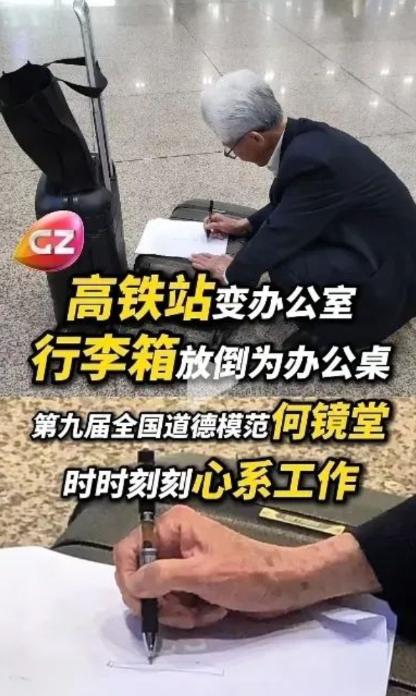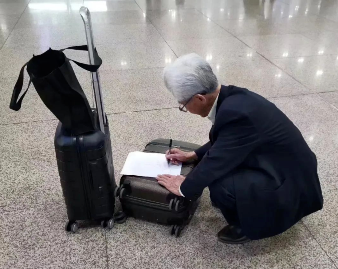 据说这张照片不是最近的,而是发生在2019 年何院士和团队出差途中。当时他们刚结束前一天的会议,面对需要快速推进的项目方案,喧闹的车站就成了工作室。